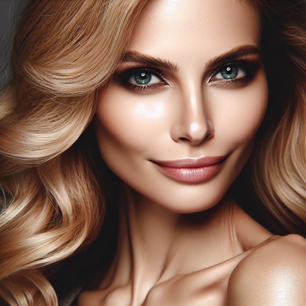 This image shows a beautiful blonde woman with a toned physique. Her captivating eyes and elegant appearance create a magnetic and alluring portrait.