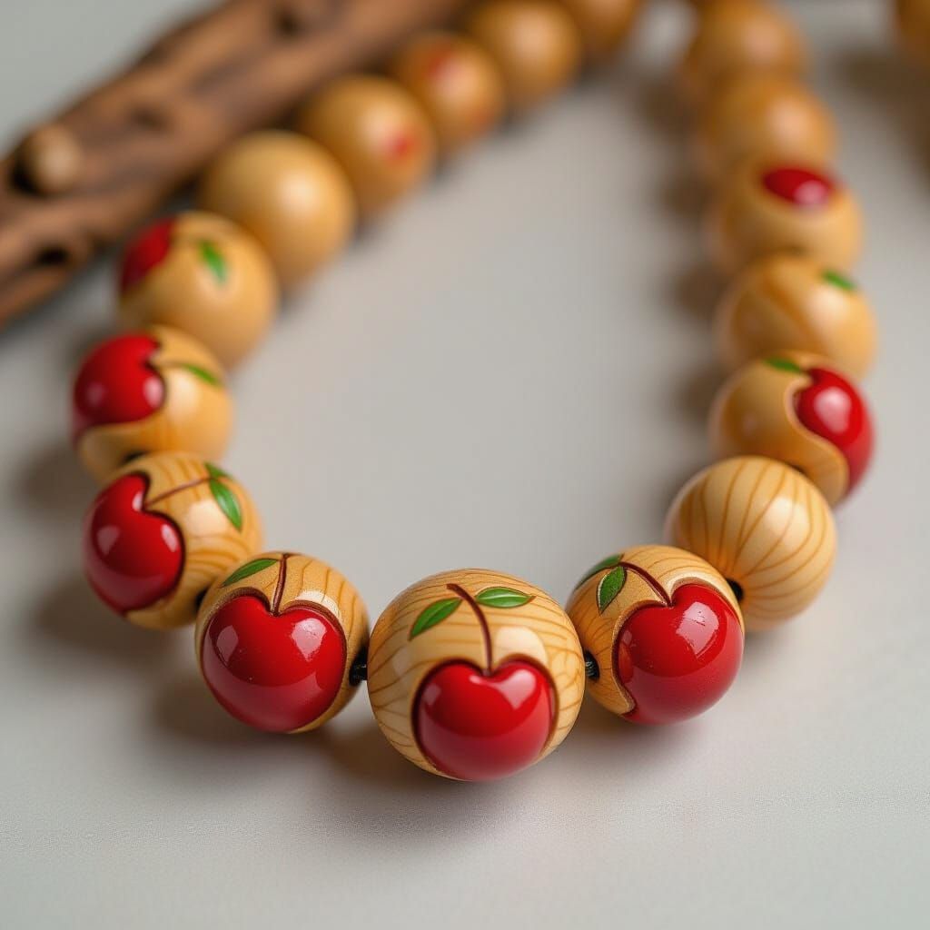This image shows a wooden bead necklace featuring cherry motifs. The beads combine natural wood textures with bright cherry red tones in a pop art aesthetic.