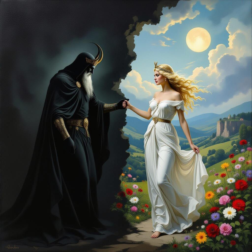 A striking picture of Hades abducting Persephone into the underworld. This realistic fantasy concept art piece depicts a stark contrast between darkness and light, with rough brushstrokes and a matte texture.