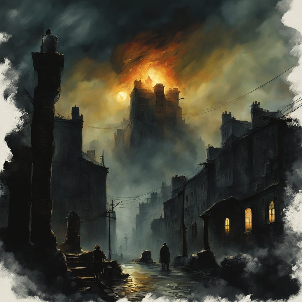 This dark, textured gouache painting depicts a monstrous Stay Puff Marshmallow Man wreaking havoc on a cityscape, with twisted brushstrokes and impasto layers evoking the eerie landscapes of Stephen Gammell and the atmospheric quality of Russell Mills