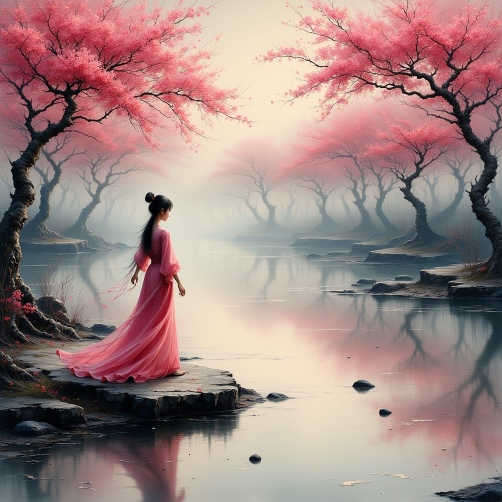 A vivid image of a girl in a silk qipao throwing a stone across a pond. The stone creates ripples in the water reflecting rose-hued blossoms in soft light.