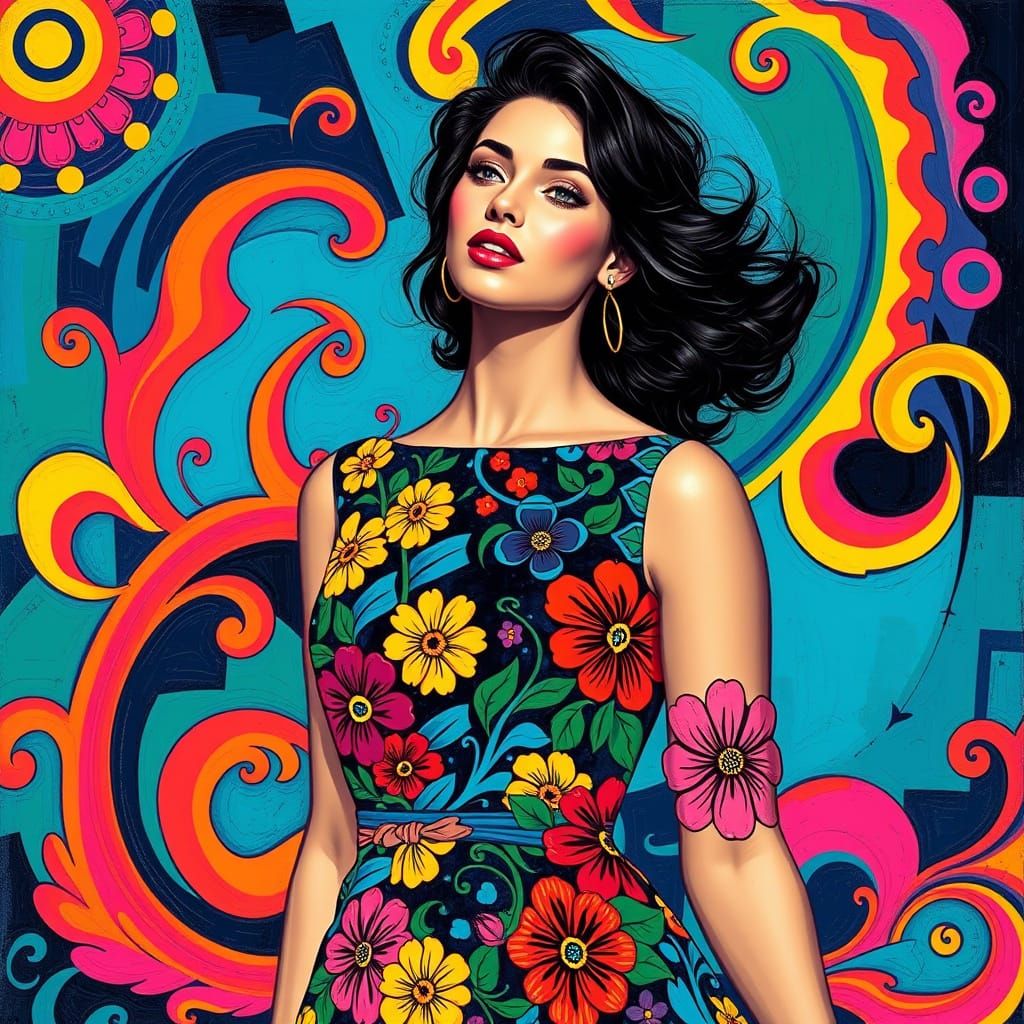 A vibrant image of a woman in a floral dress amidst swirling psychedelic patterns. The artwork is inspired by 1960s pop art with bold brushstrokes and bright colors.