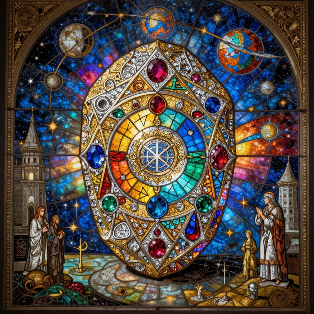 Generate unique stained glass philosopher's stone images with precious metals and gems. Easy and free AI art creation.