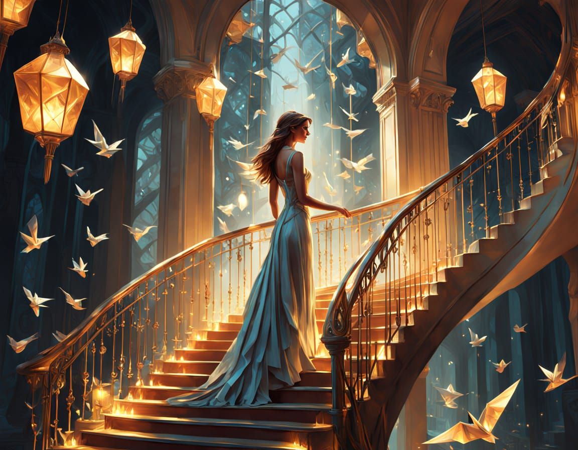 This image shows a figure on a crystal staircase painting glowing origami birds. Golden lanterns and light trails add to the surreal, ethereal mist in a nouveau style with fine brushwork.