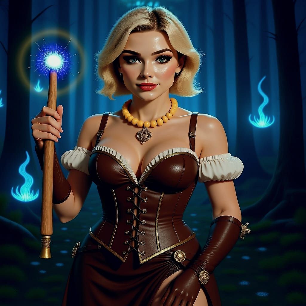 This image shows a blonde woman with a short haircut wearing a brown corset dress with golden accents and a yellow necklace. Rendered with dynamic lighting to create a cinematic feel.