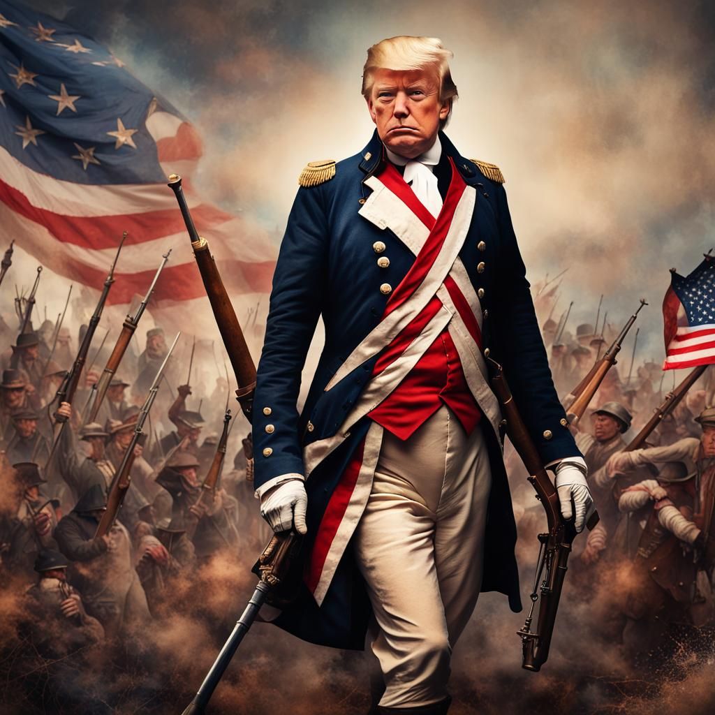This image portrays a muscular man in a Revolutionary War soldier's uniform, complete with USA flag tattoos, posed amidst a historical battle scene. The artwork features bokeh effects and rich, deep color.