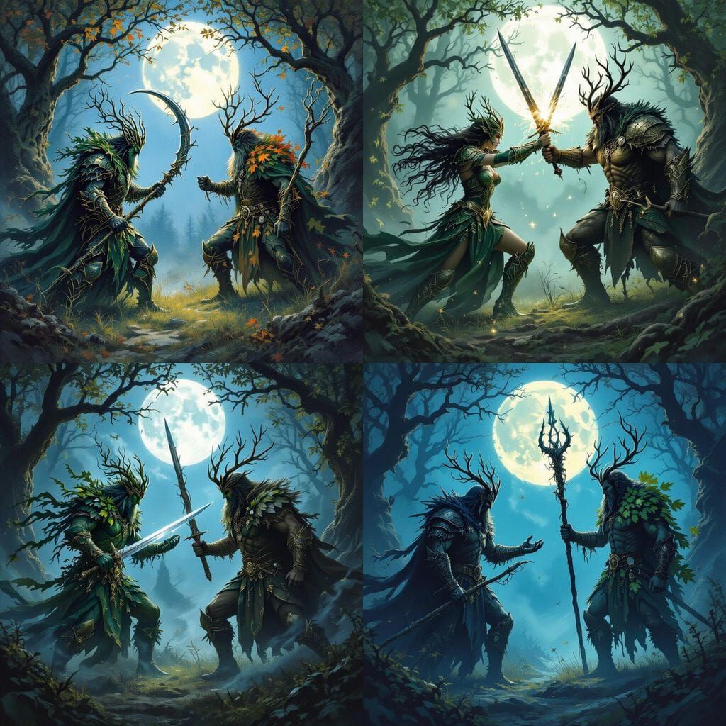 This image depicts the legendary battle between the Holly King and Oak King, set against a dramatic moonlight backdrop. The scene captures the intensity of their mythical conflict.