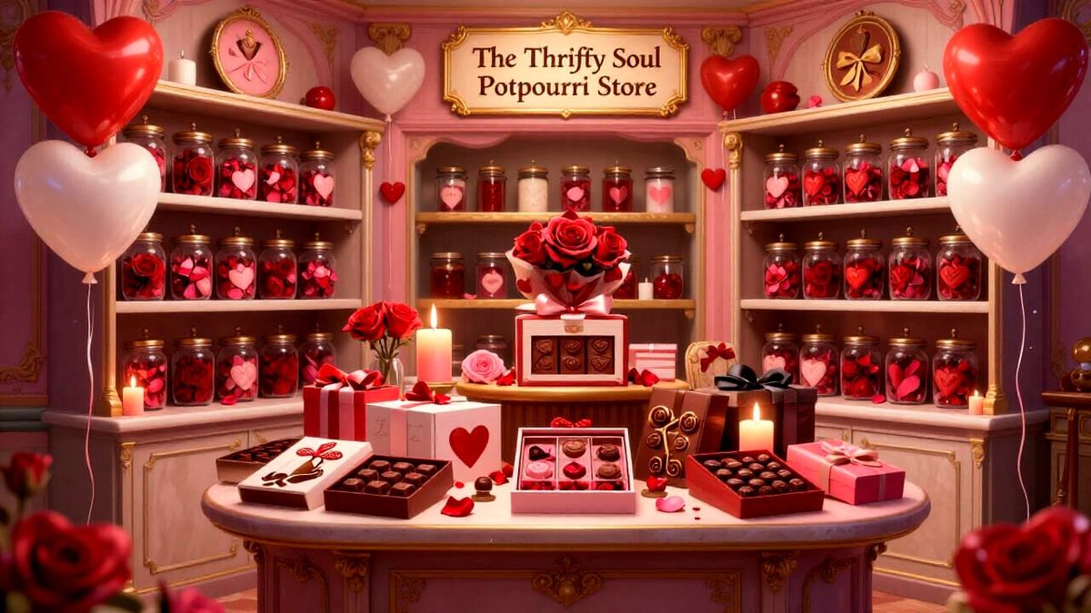 This image shows a Valentine's themed potpourri store filled with chocolates, rose petals, candles, and heart balloons. Rendered in a detailed matte painting style with rich colors.