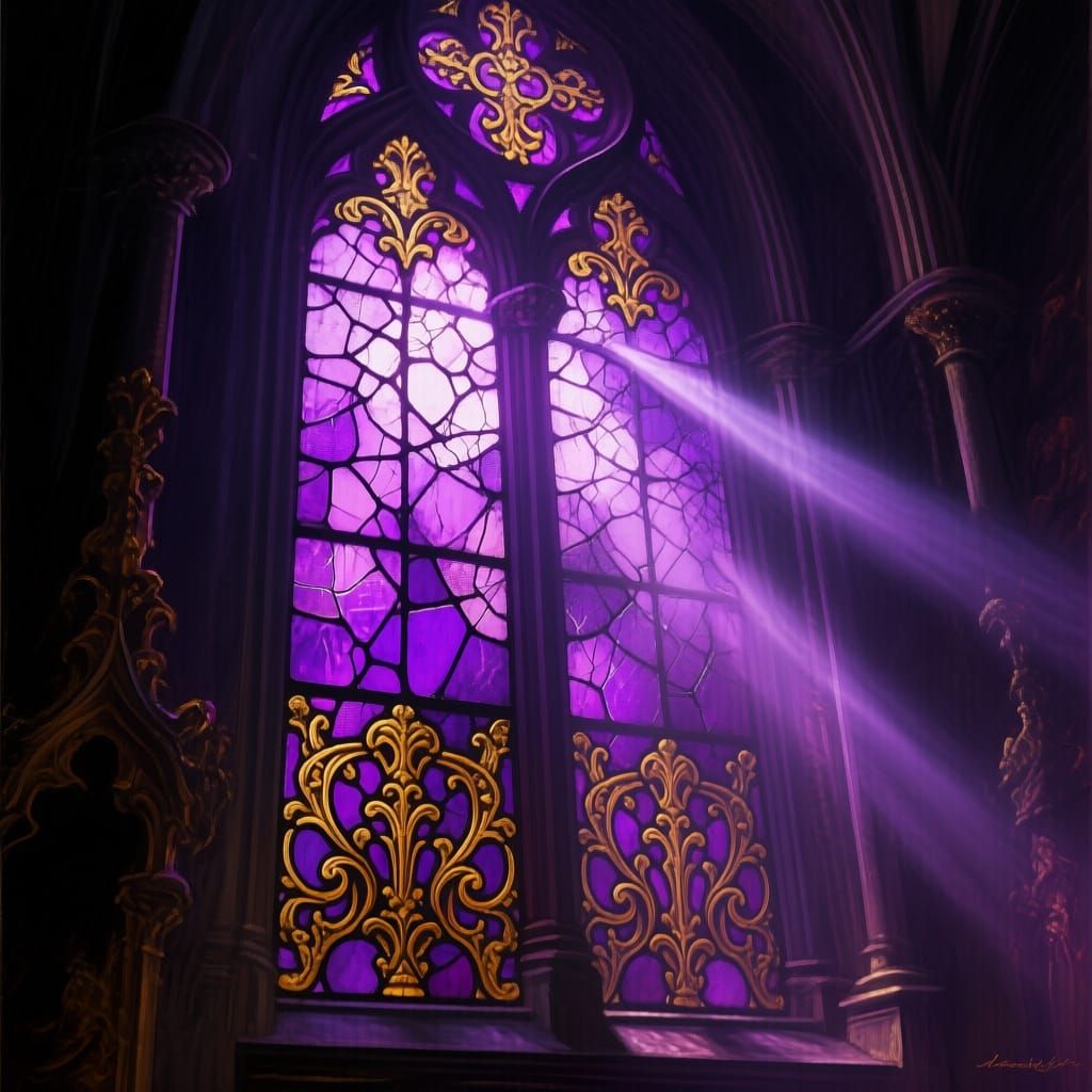 Masterpiece stained glass window in Gothic Baroque style, featuring amethyst and plum colors, cracked textures, and gold tracery. Dramatic cathedral light creates a sacred yet ominous mood with rich, painterly detail.