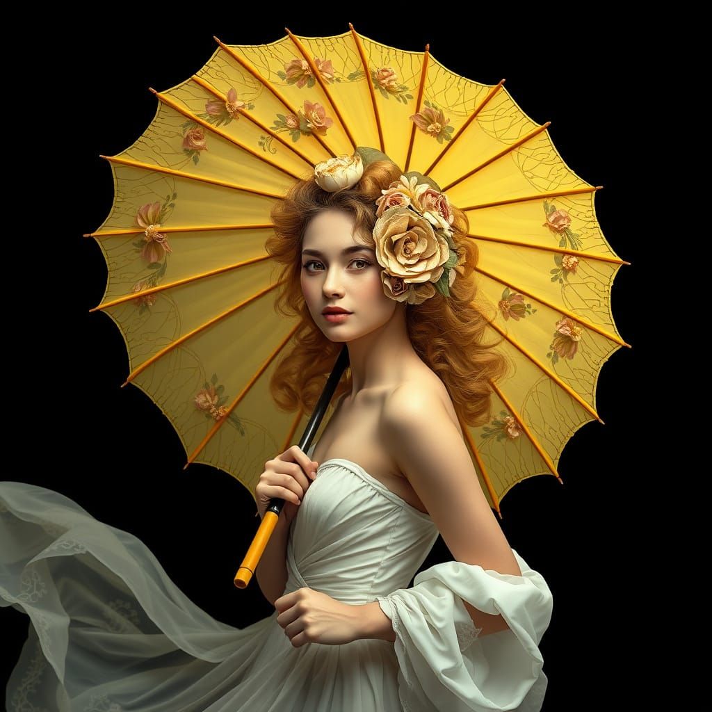 A beautifully detailed illustration of a woman with elaborate golden curls, holding a decorative yellow umbrella adorned with flowers, exuding elegance and charm against a black background