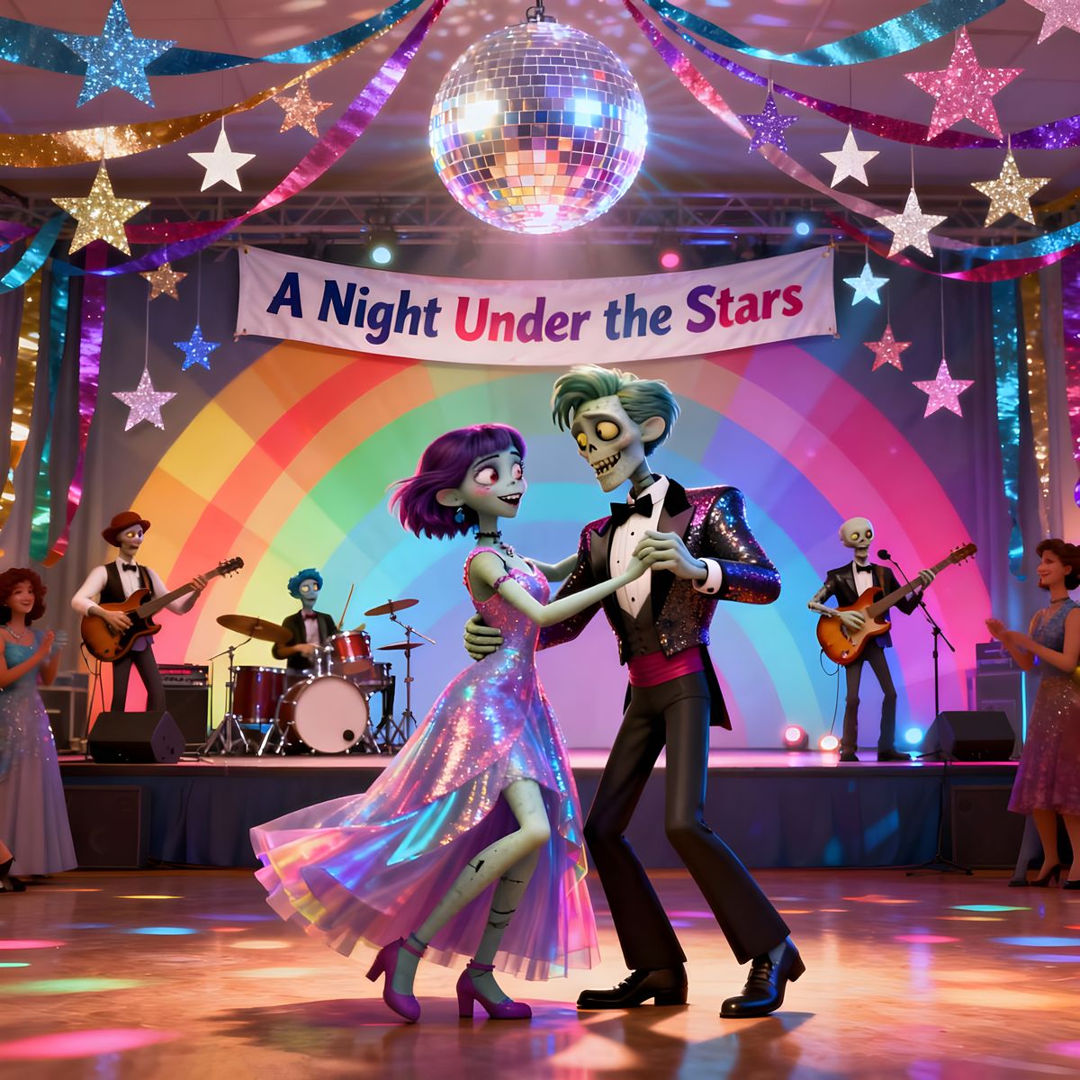 This vibrant 3D digital art depicts a zombie couple enjoying their high school prom. They dance under a disco ball, surrounded by festive decorations, rendered with cinematic quality.