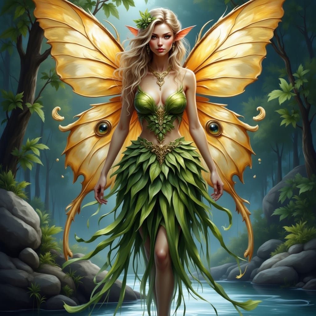 A striking picture of a beautiful fairy with moth wings relaxing by a river. She has blue eyes and a leaf skirt, depicted as digital art with a magical aesthetic.