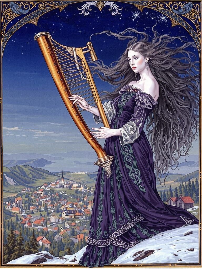 This enchanting painting captures a mystical banshee on a snowy mountain peak, surrounded by ethereal light and intricate Celtic details. A masterful blend of Art Nouveau and Celtic elements.