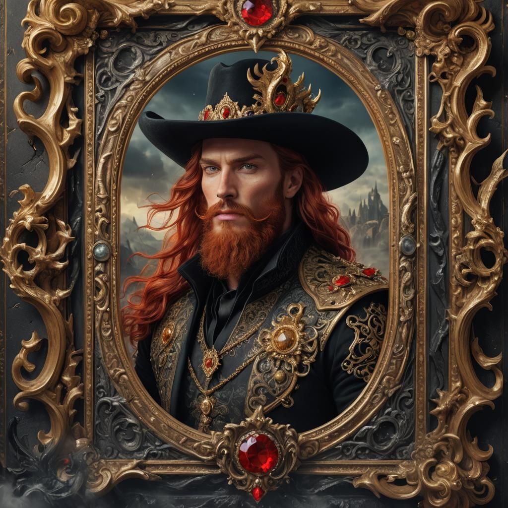 This image shows a detailed matte painting of a prince with a red beard and jeweled crown, wearing baroque clothing and a cowboy hat, surrounded by swirling dragons.