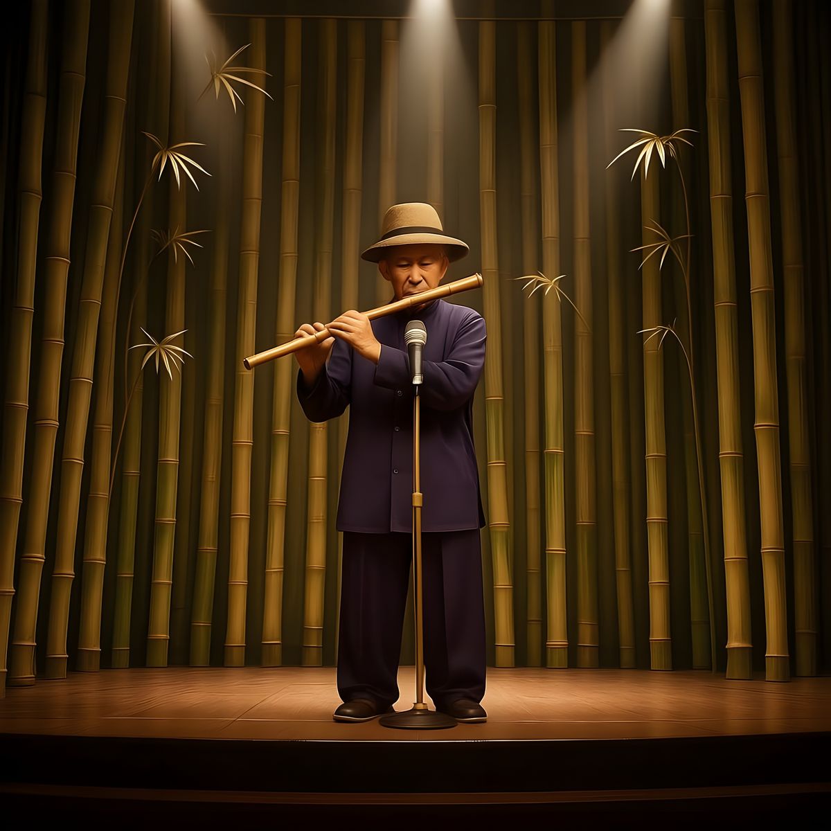 This image depicts a musician playing a bamboo flute on a stage adorned with bamboo elements, including a bamboo microphone and backdrop.