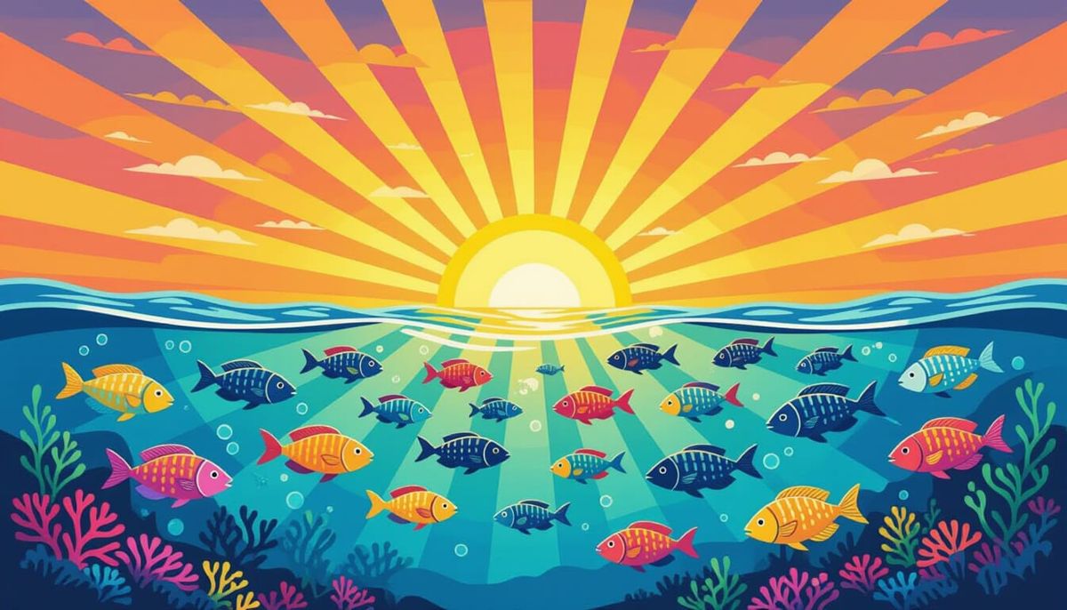 This image shows a sunrise over a school of brightly colored fish. The illustration uses a stick art style with patterned rays of sunlight in vibrant colors.