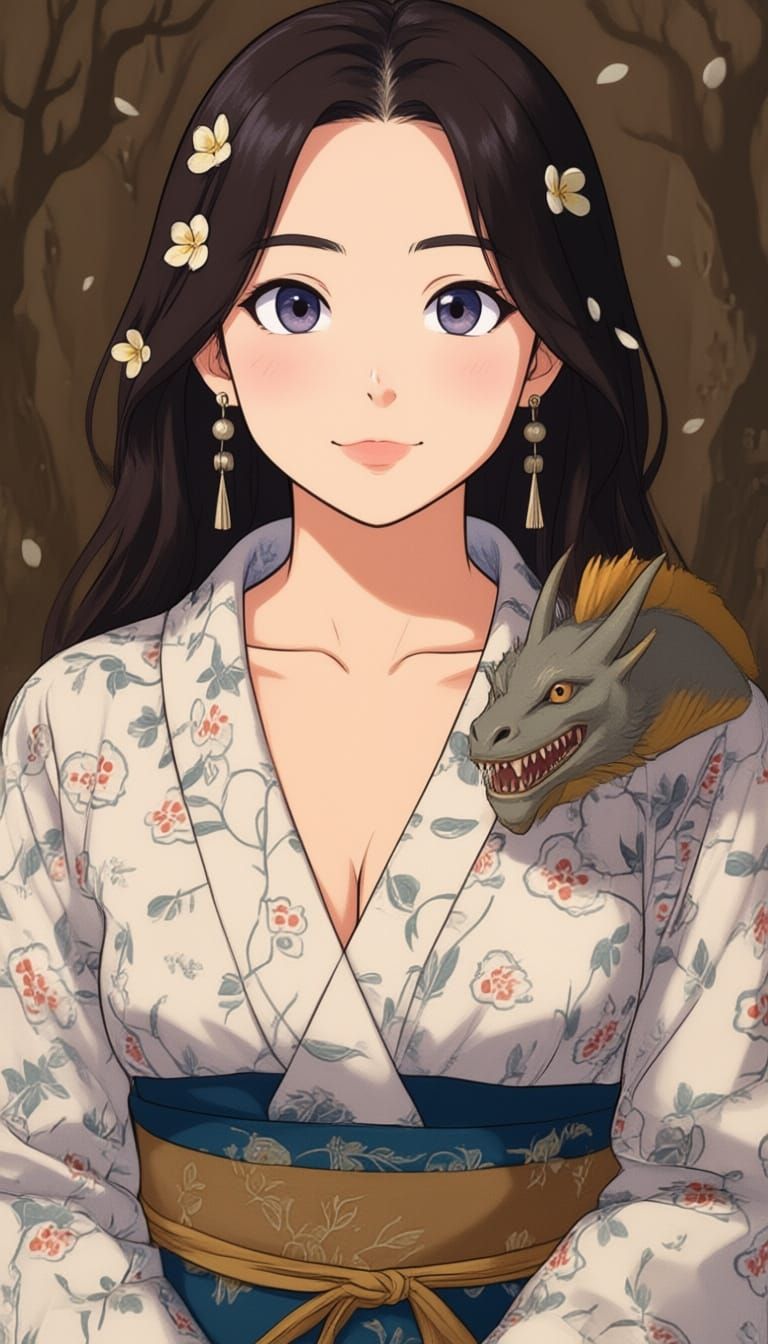 A striking portrait of a geisha with long, flowing black hair framing her face, featuring a delicate flower design on her forehead.