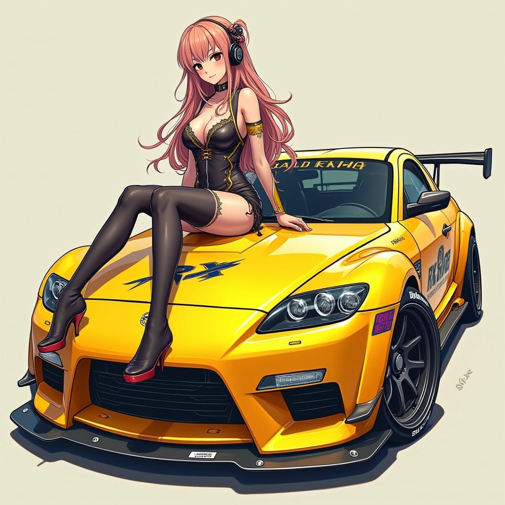 A yellow Mazda RX-8 sports car with racing modifications and a manga-style woman sitting on the hood. The vehicle is depicted with dynamic lines and stylized elements.