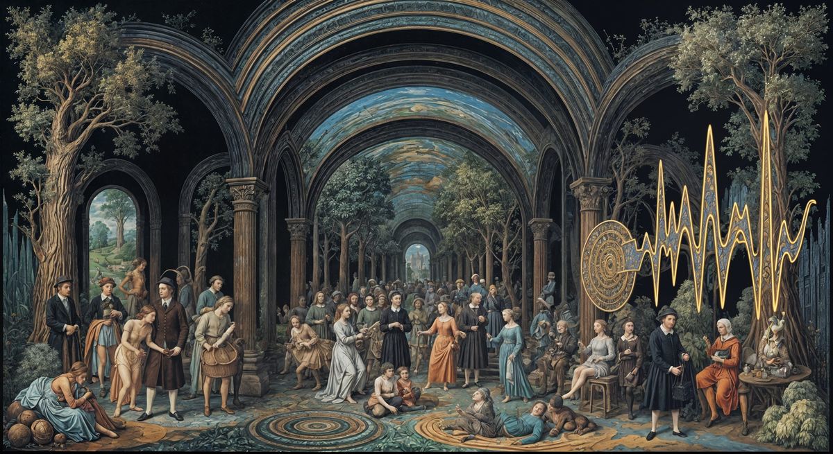 This abstract vector fractal image depicts the Garden of Earthly Delights with wave function and Zentangle elements, rendered in vibrant, dreamlike colors with 3D shading.