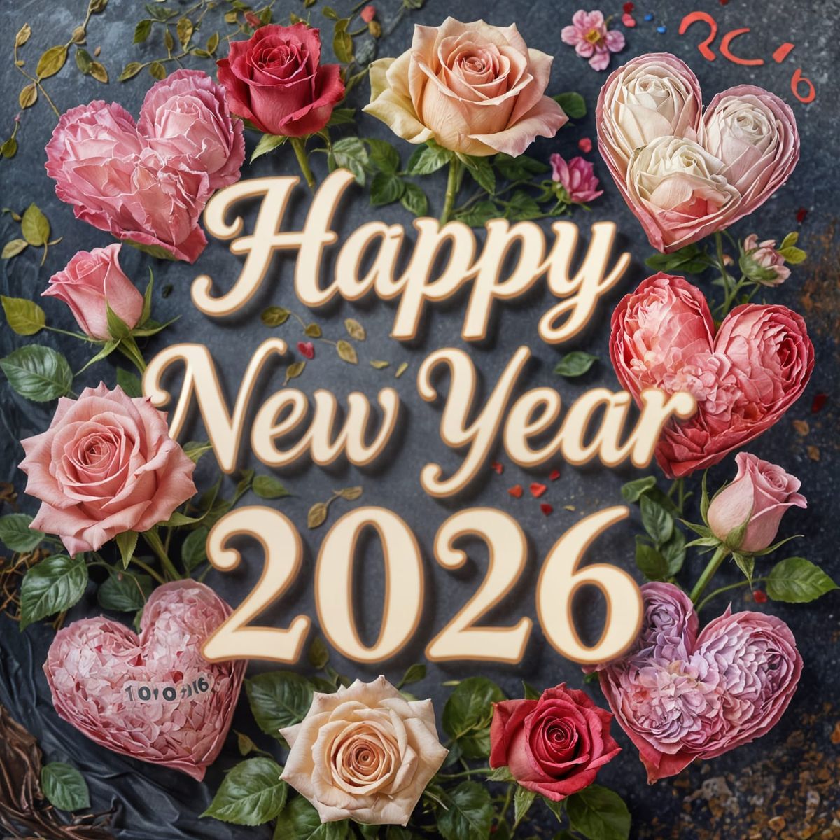 Happy New Year 2026! Flowers, roses and hearts