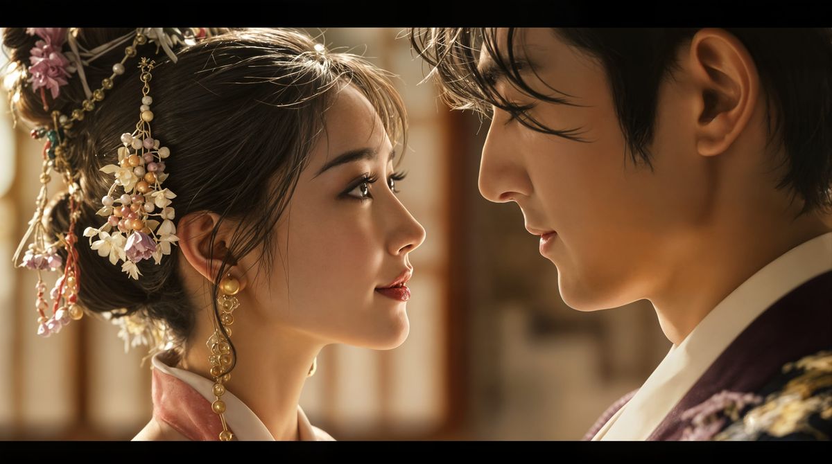 A stunning man, and a woman with ornate jewelry in her hair, look at each other. The scene is like that out of some historical kdrama, with a very cinematic look and feel.