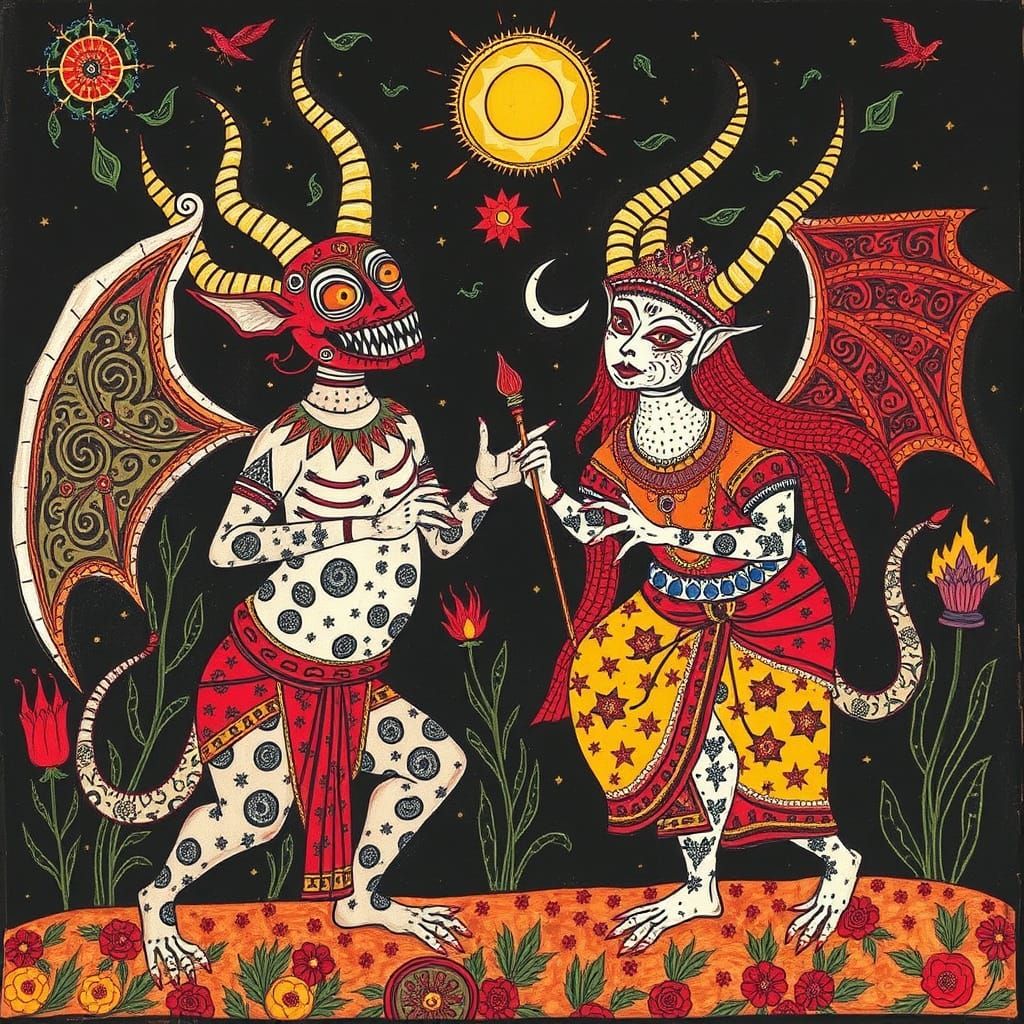 Easily design unique Madhubani paintings of demons and mythical figures with our free AI image generator.