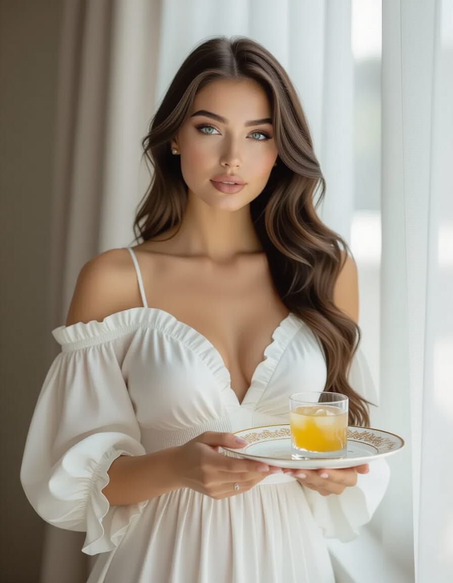 This image showcases a curvy maid with striking blue eyes making direct eye contact. She is holding a cocktail, with flowing locks and wearing an elegant dress, all rendered in an Art Nouveau style.