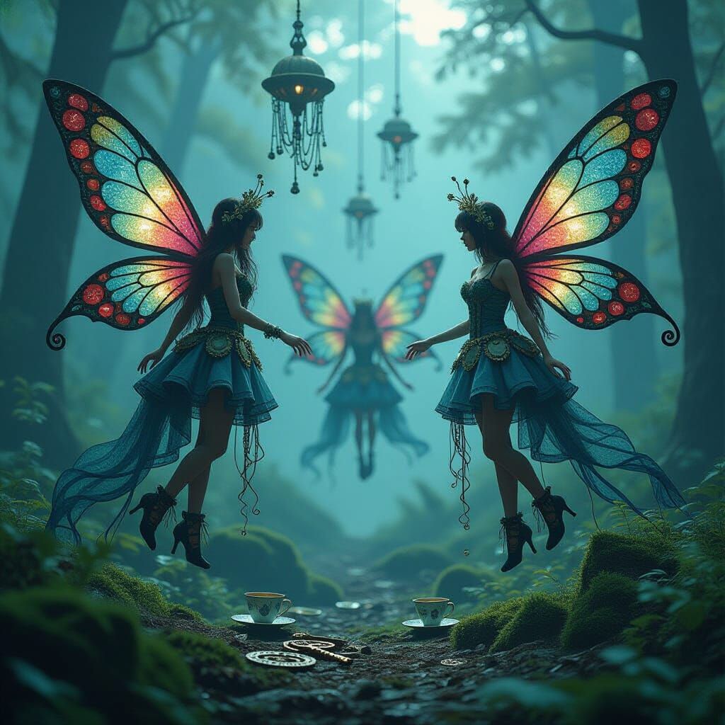 A surreal image shows unconventional fairies hovering above a misty forest floor. The fairies have stained glass wings, mechanical gears, and jellyfish tentacles, in a hyper-detailed steampunk style.