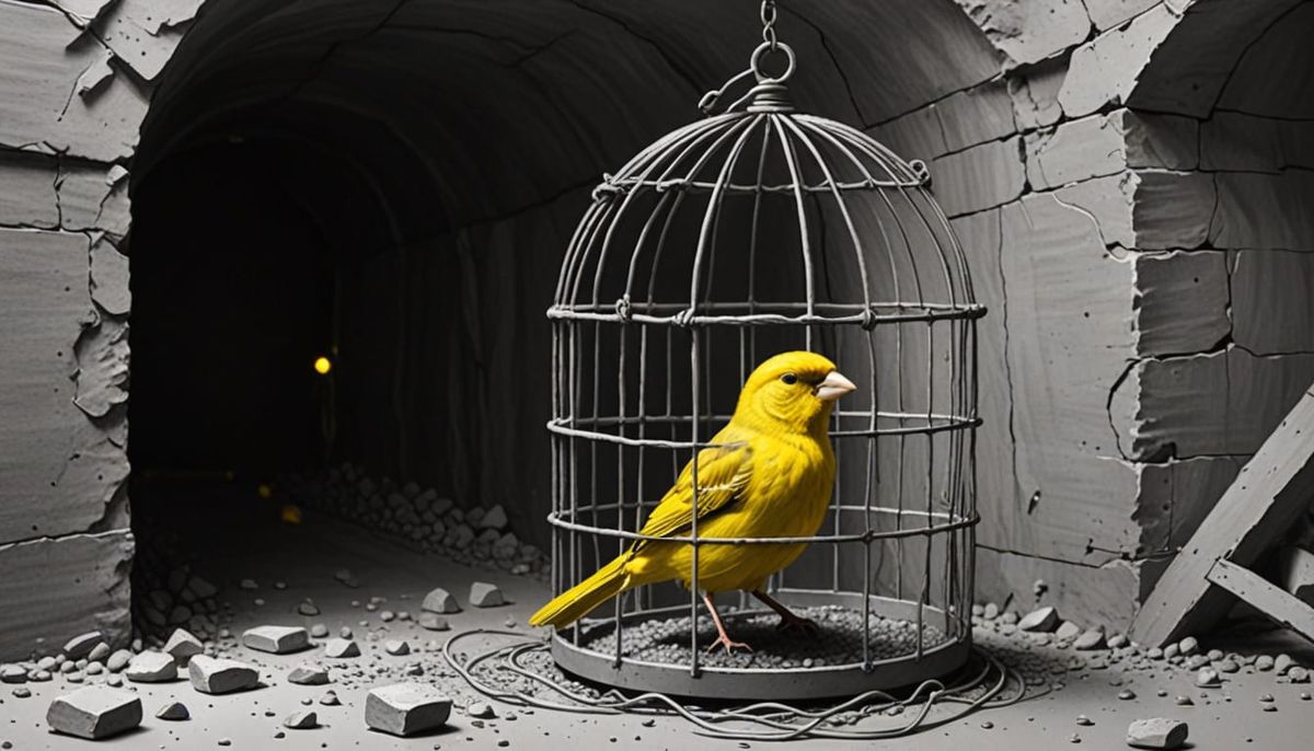 A minimalist pen and ink sketch shows a vibrant yellow canary in a cage within a predominantly gray underground mine tunnel, highlighting the bird's solitary color.