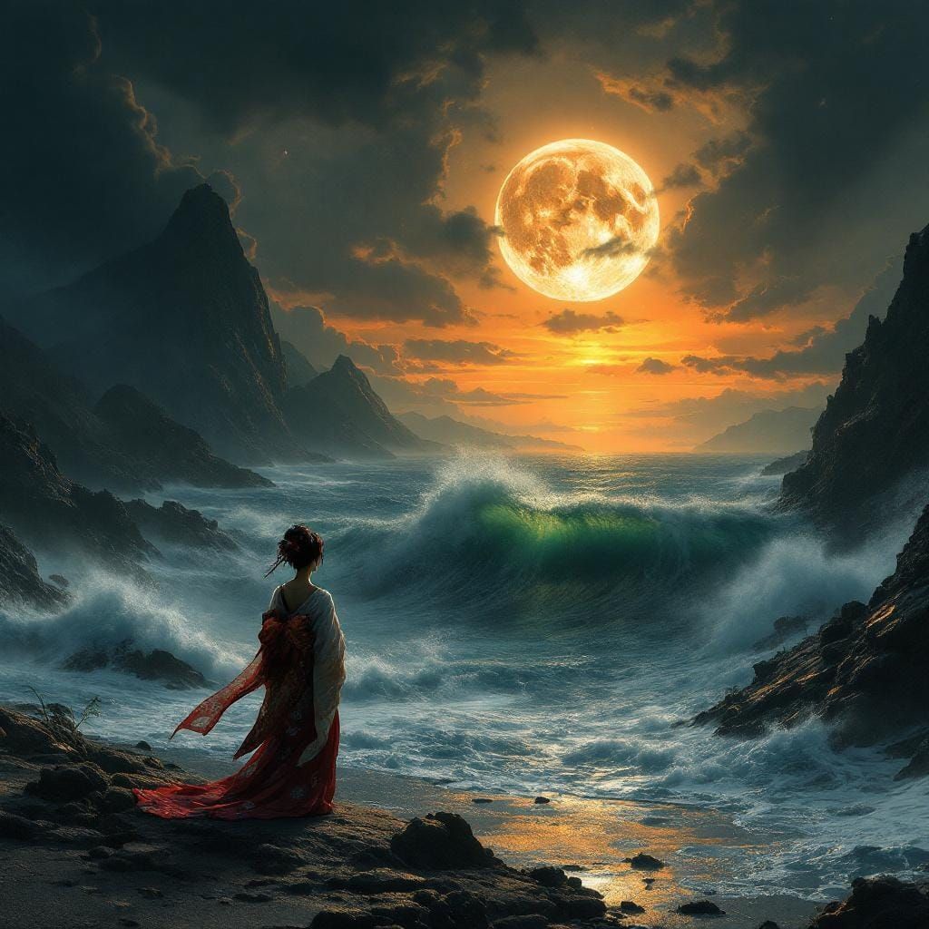 A dramatic scene of a geisha gazing at a stormy ocean under a sunset moon. This image features desaturated colors, golden hour lighting, and a moody atmosphere, as fantasy concept art.