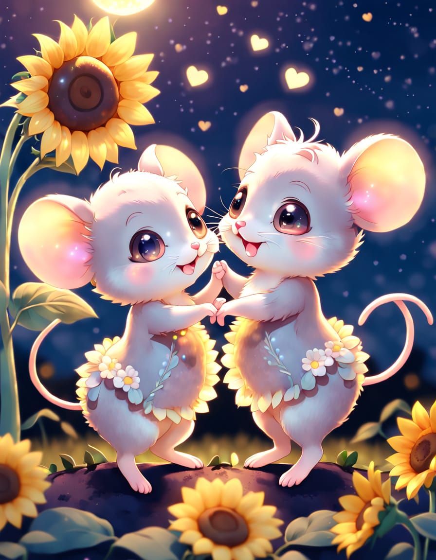 Anime :: cute [ Two mice are dancing on a sunflower under a bright moonlit night ], kawaii, chibi, [ pearly light peach-creamy iridescent shining colour hues] cartoon, big cute bright eyes, high definition :: cartoonish, smooth fluffy extra soft texture, happy, bokeh, glimmering hearts