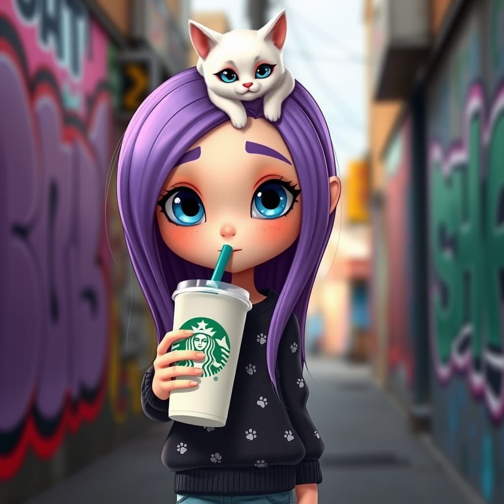A stylized girl with purple hair and freckles drinks from a Starbucks cup on a graffiti-lined street. A playful cat with heterochromia sits on her head. Digital art with a cartoon style and urban bohemian vibe.