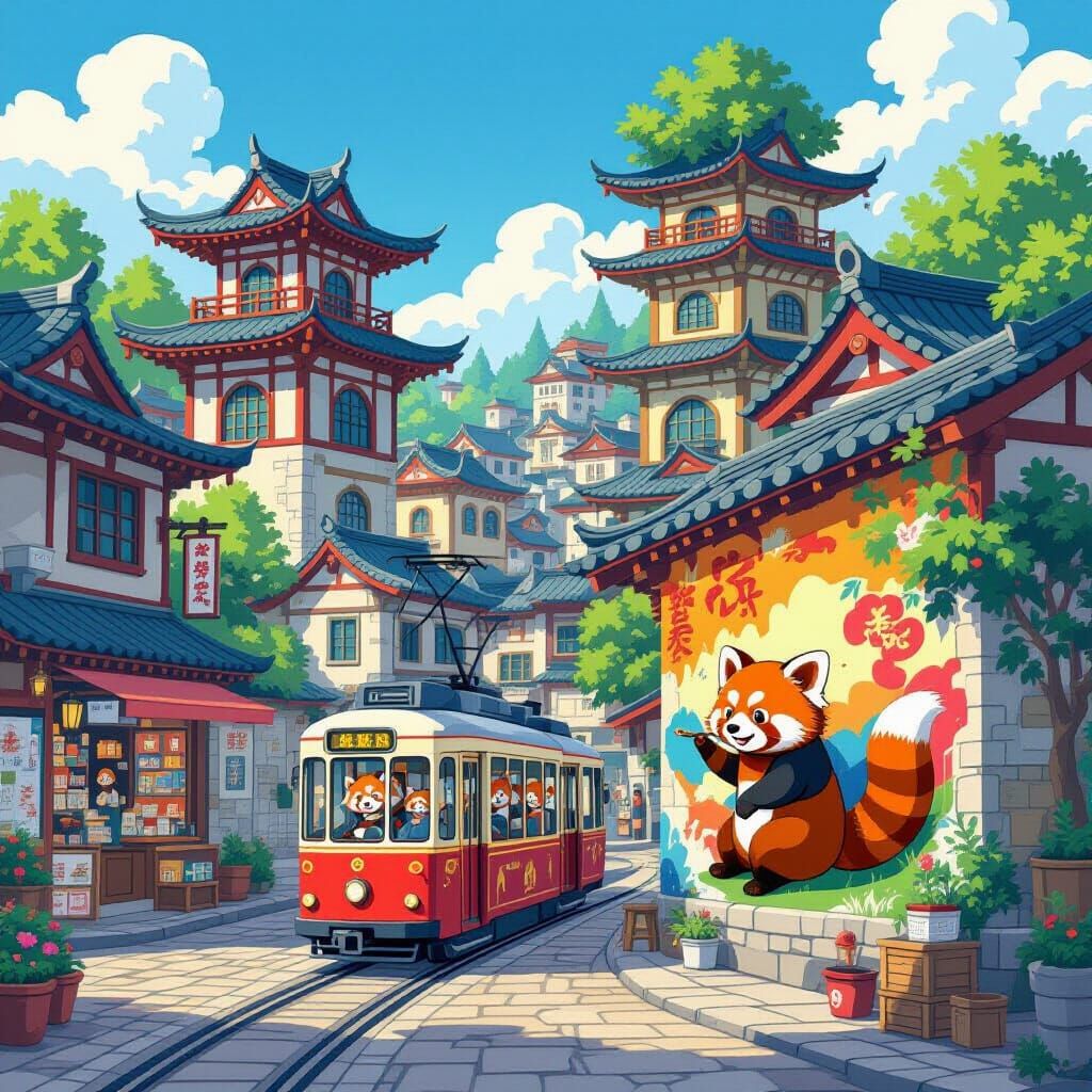 A vibrant cartoon illustration depicts a charming city where red pandas run shops and ride trams. Features Asian architecture, organic buildings, and a street artist. Lively animation style.