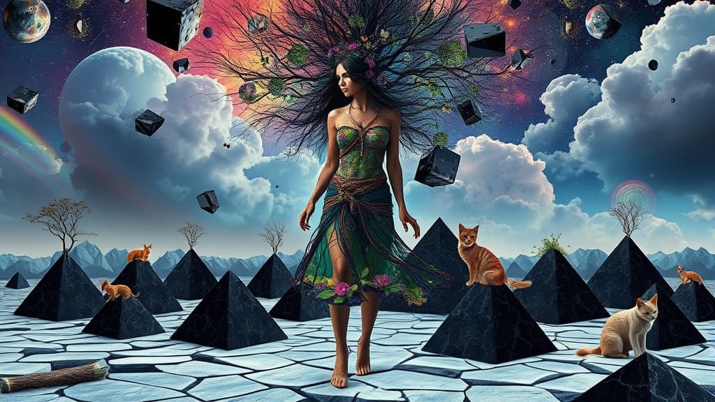 This image shows a mystical woman composed of tools and plants, walking barefoot on pyramids in a surreal, dreamlike atmosphere. Collage style artwork featuring interconnected ecosystems and miniature creatures.