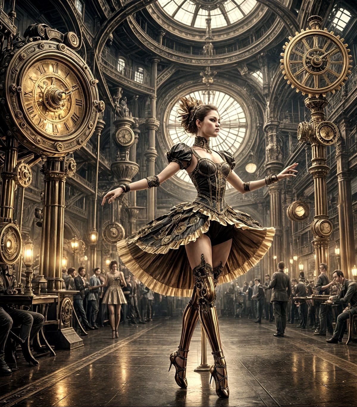 A striking picture of a clockwork ballerina dancing on a metallic stage. Applauding robots watch her performance in this steampunk-style digital painting.