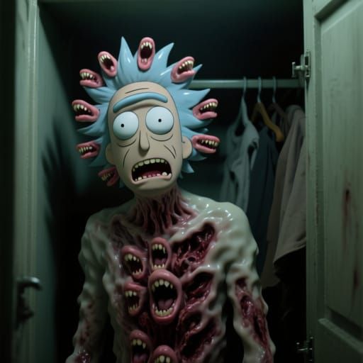 This image shows a photorealistic yet unsettling figure reminiscent of Rick Sanchez. Human mouths replace his hair, set in a claustrophobic, dimly lit closet. The artwork evokes surreal body horror.