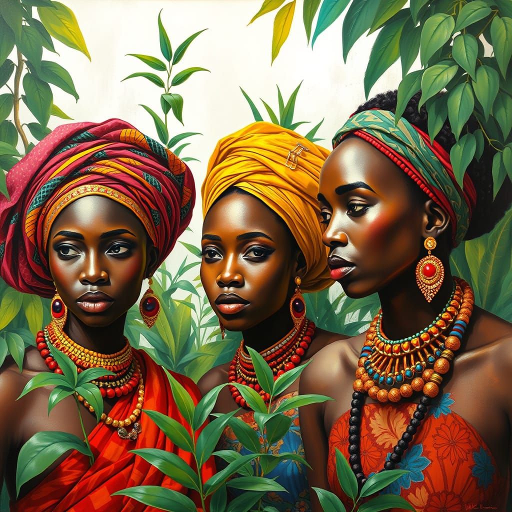 This image shows African tribal women adorned in vibrant traditional clothing amidst lush greenery. The artwork blends realistic and impressionistic brushstrokes to create a captivating scene.