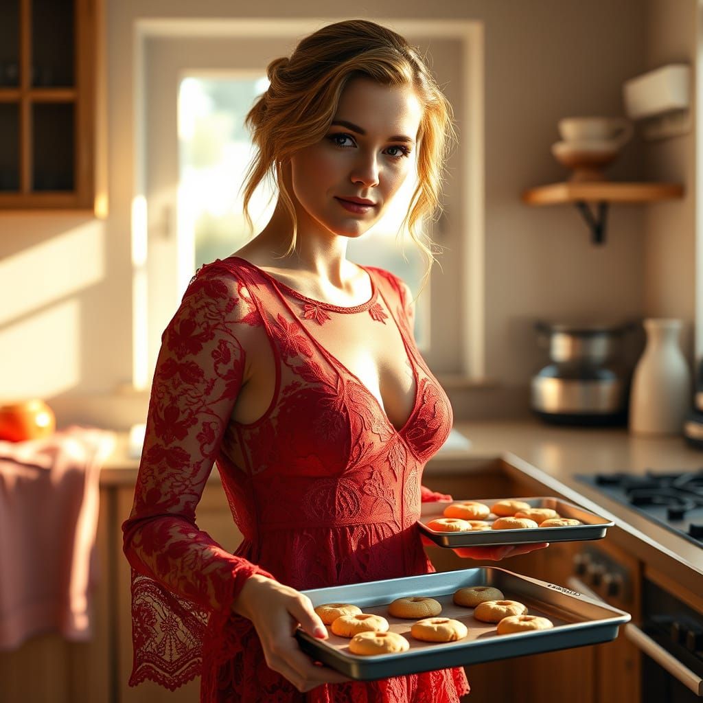 This image shows a woman in a sunlit kitchen, holding a tray of freshly baked cookies. The scene is captured with cinematic lighting and soft, warm tones, highlighting intricate details.