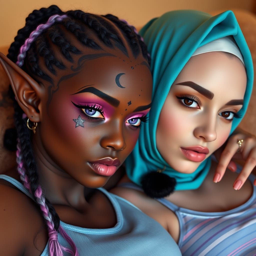 This enchanting image features a black elf woman with striking purple eyes and shimmery pink eyeshadow, surrounded by intricate facial markings and adorned with mystical accessories, snuggled up with a white woman in a cozy atmosphere.