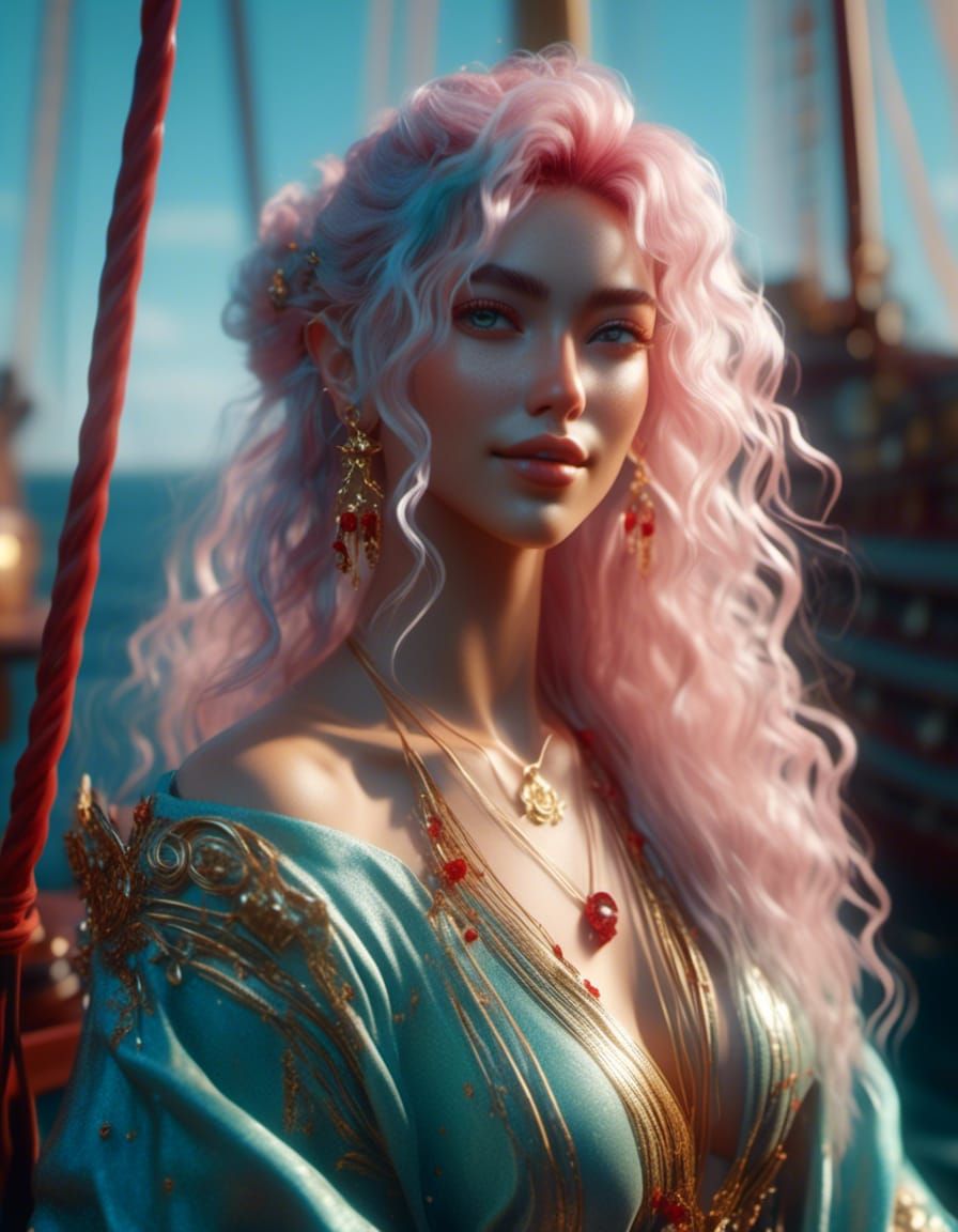A captivating digital illustration of a sea queen with cyan hair on a ship. She wears a red and gold robe amid twinkling lights with hyperrealistic textures and dynamic lighting. The aesthetic is bright, polished and ornate.
