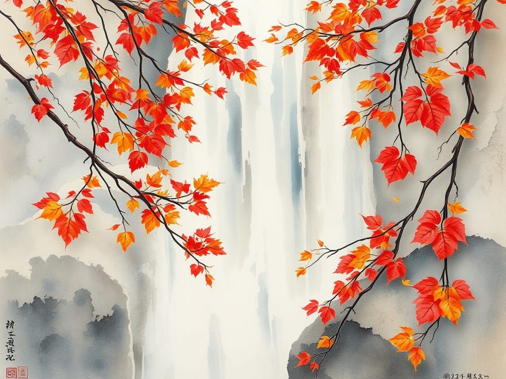This image showcases a stunning, meticulously detailed watercolor painting of an autumn waterfall. Vibrant red and yellow leaves adorn nude branches, creating a poetic and romantic scene.