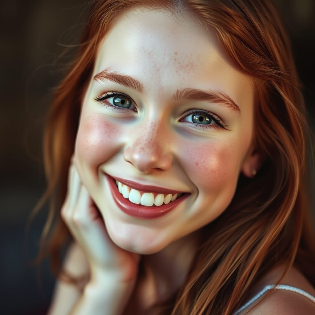 This image shows a smiling auburn-haired girl with freckles. The portrait is lit with a warm, natural light and captured with a soft, cinematic style.