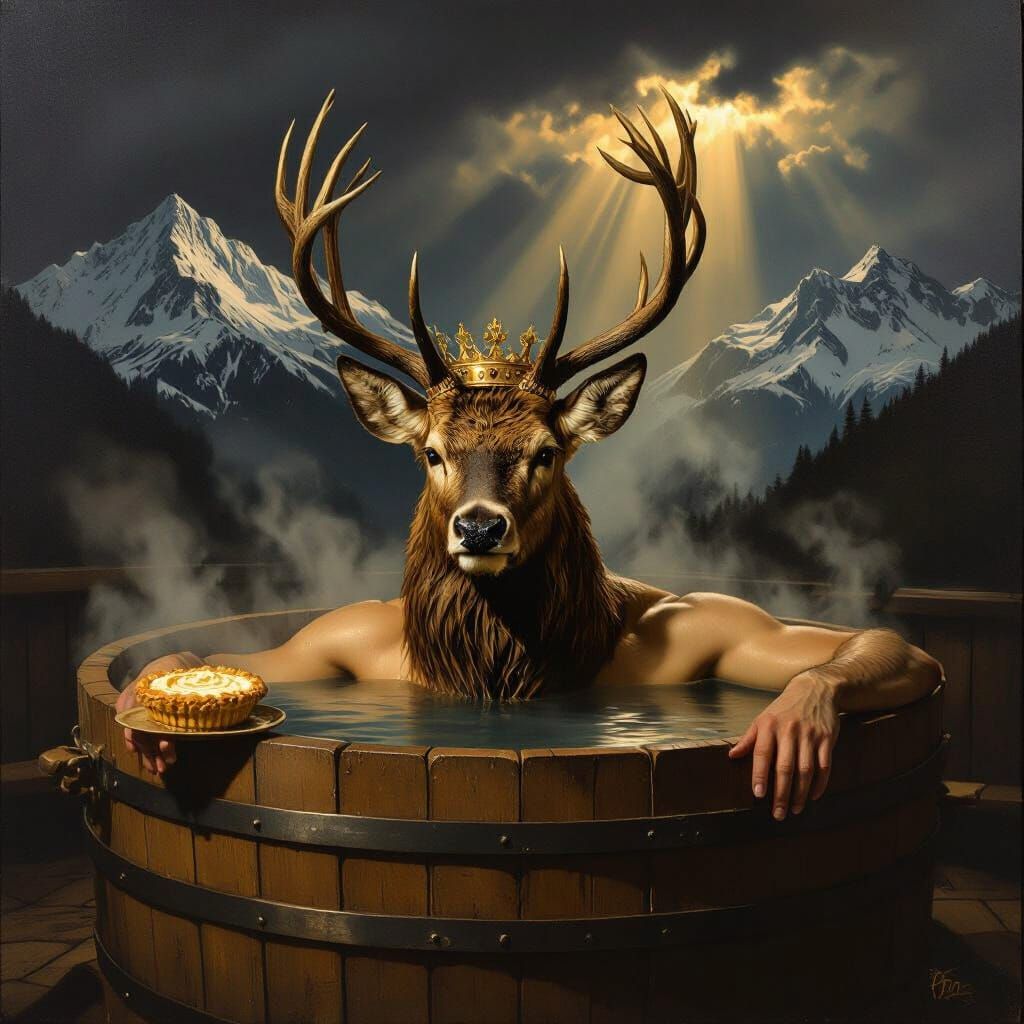 This image shows a noble stag head crowned and merged with a tanned human body, relaxing in a steaming, dark wooden hot tub. Dramatic lighting and deep shadows create an ethereal atmosphere.