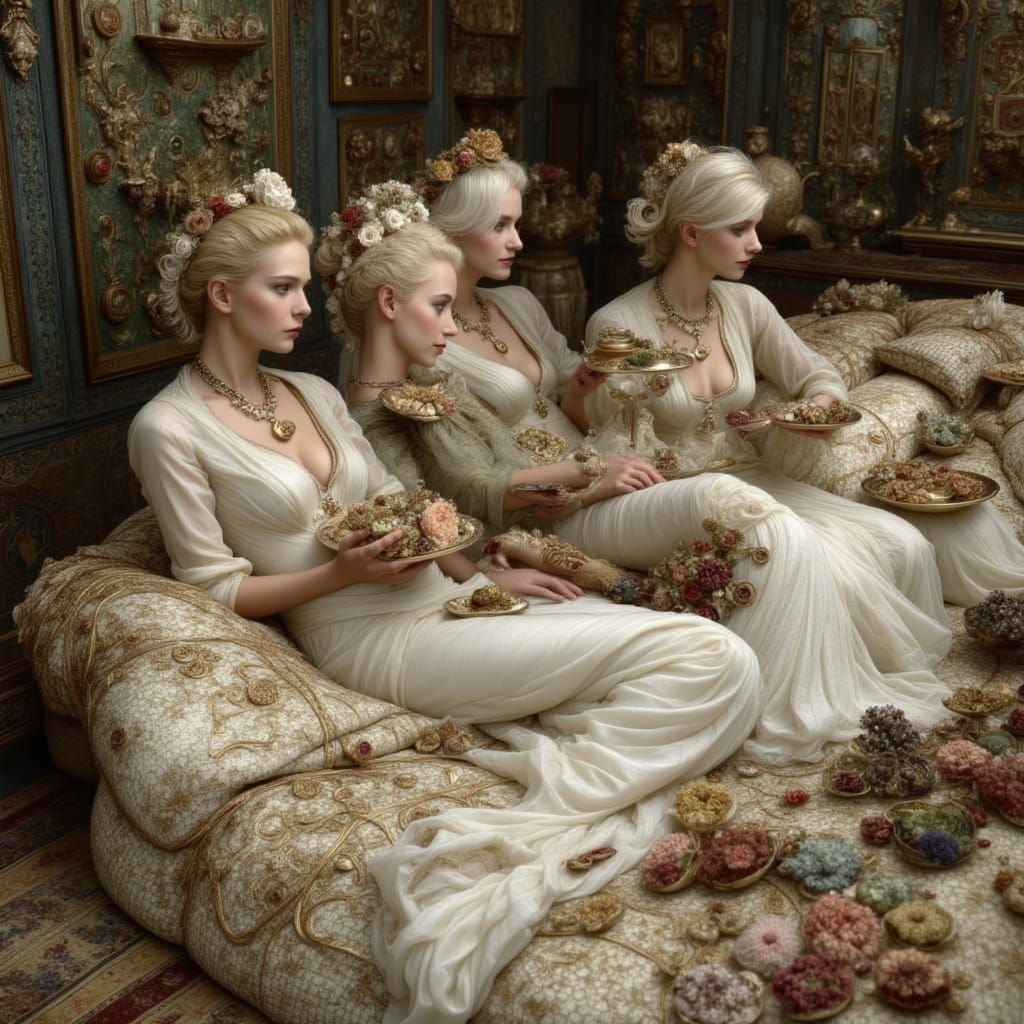 A photo-surreal image of a man with white horses and satin-clad ladies. The scene evokes luxury with lace, feathers, and a gold-covered mattress, rendered in a surreal aesthetic.