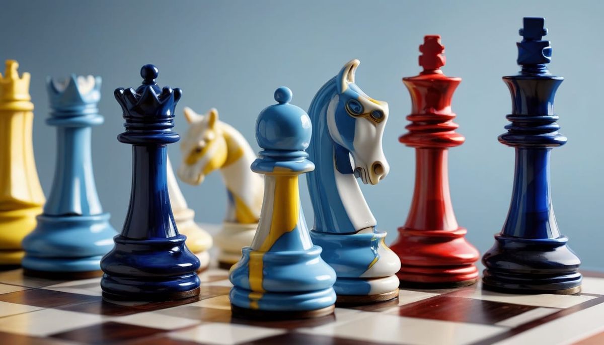This image showcases a stunning, hyperdetailed representation of a Piet Mondrian-inspired abstract composition, with intricate details and vibrant colors, featuring a chess set on a giant board.