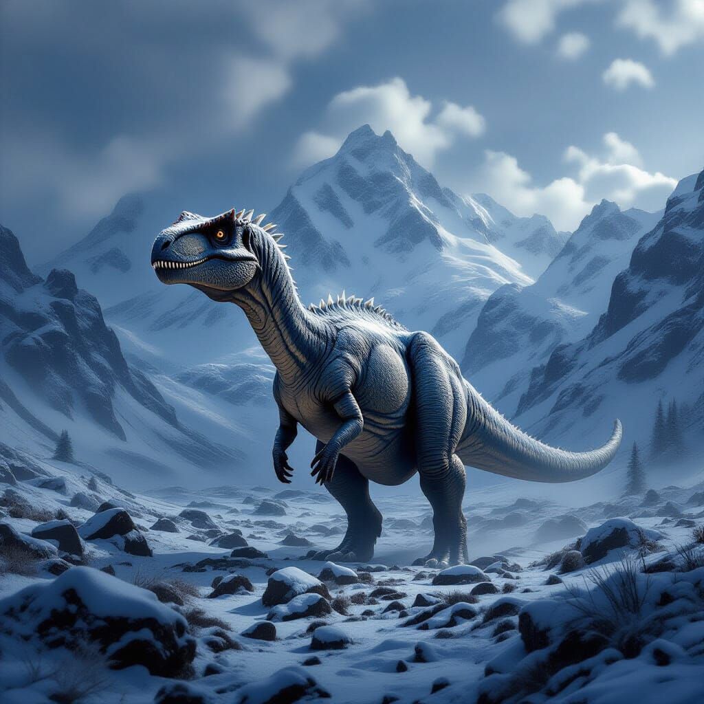 This image shows a lone, frost-covered dinosaur standing in a desolate Jurassic landscape. Snow-capped mountains loom in the background under a dark, cloudy sky. The artwork combines realism and dark atmosphere.