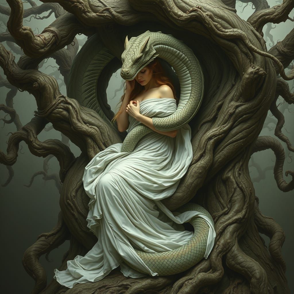 This image shows a woman in a white dress entwined with a large snake in an old tree. The artwork features intricate details and blends realism with mystical elements, in a digital art style.
