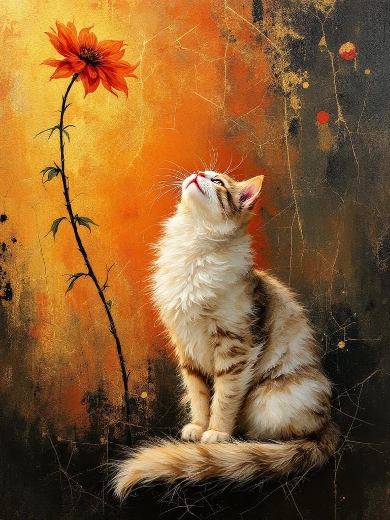 A digital painting of a cat beneath a flower with a split background. The image evokes romanticism with golden light, reminiscent of classical compositions and luminous realism.