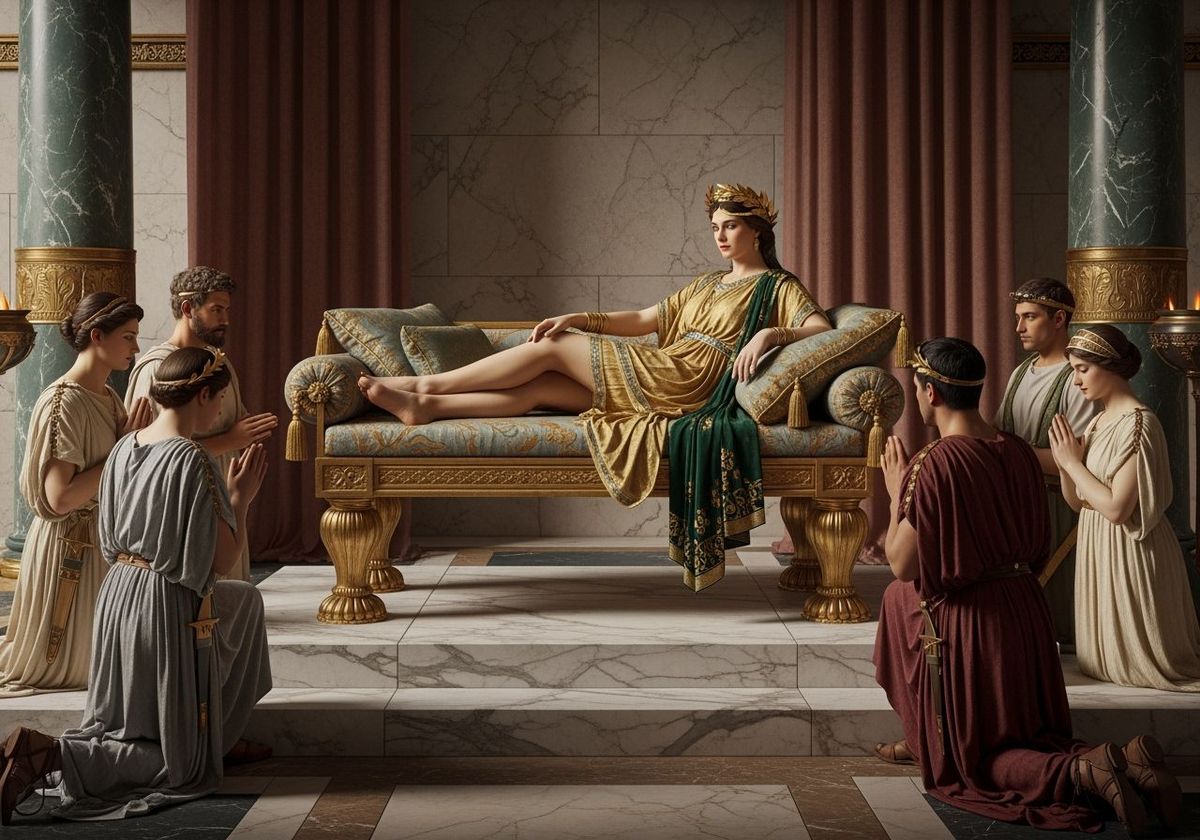 This image shows Empress Messalina lounging on a chaise longue in her palace, surrounded by servants. The scene evokes the opulence of Ancient Rome. The artwork is photorealistic with natural lighting.