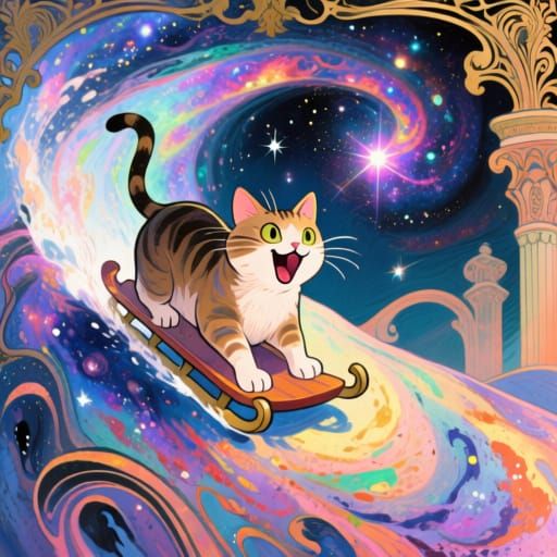 This image shows a cat joyfully sledding down a nebula-filled hill, depicted with flowing lines and organic forms in a wet brush art nouveau aesthetic with cosmic colors.